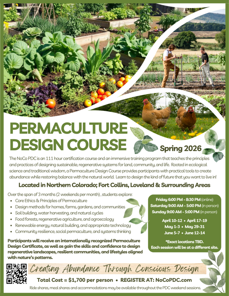 The NoCo PDC is an 111 hour certification course and an immersive training program that teaches the principles and practices of designing sustainable, regenerative systems for land, community, and life. Rooted in ecological science and traditional wisdom, a Permaculture Design Course provides participants with practical tools to create abundance while restoring balance with the natural world.